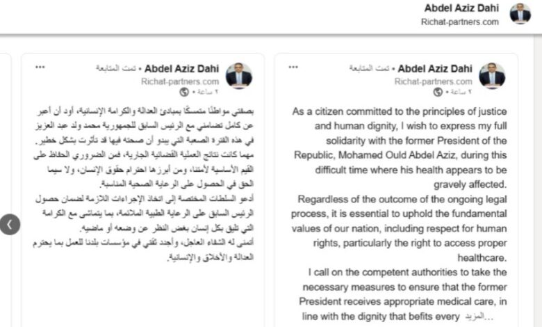 ودعا ولد داهي في تدوينة على حسابه في “لينكد إن” السلطات المختصة “إلى اتخاذ الإجراءات اللازمة لضمان حصول الرئيس السابق على الرعاية الطبية الملائمة، بما يتماشى مع الكرامة التي تليق بكل إنسان بغض النظر عن وضعه أو ماضيه”.