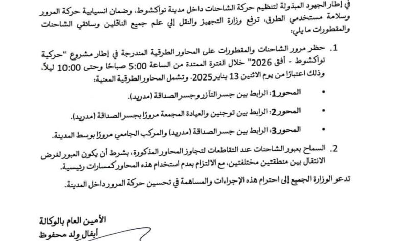 أصدرت وزارة التجهيز والنقل قرار يحظر على الشاحنات والمقطورات المرور على عدد من المحاور الطرقية في العاصمة نواكشوط، وذلك اعتبارا من الاثنين 13 من شهر يناير الجاري.